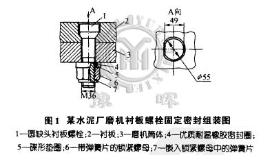 所以水泥廠從國外引進生料磨、水泥球磨機等多種設備投入運轉。其襯板固定螺栓采用了帶彈簧片的鎖緊螺母和碟形墊圈加優質耐溫像膠密封圈進行緊固和密密封等新型結構,使用多年來一直很理想,如圖1所示。