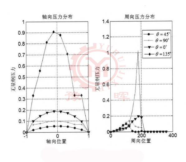 由不同旋轉角度下的球磨機橢圓軸處的油膜厚度分布情況我們可以知道,隨著橢圓的長軸圍繞主軸軸心做逆時針運轉,此時的動靜壓軸處油膜厚度也會發(fā)生一定的變化,而較小油膜的厚度則是先增加后減小然后在增大的變化。同時我們還可以了解到球磨機油膜厚度會有兩個較低谷出現(xiàn),這些低谷則意味著動壓油楔的產生,同時此區(qū)域也是我們所稱的動壓力區(qū)。
